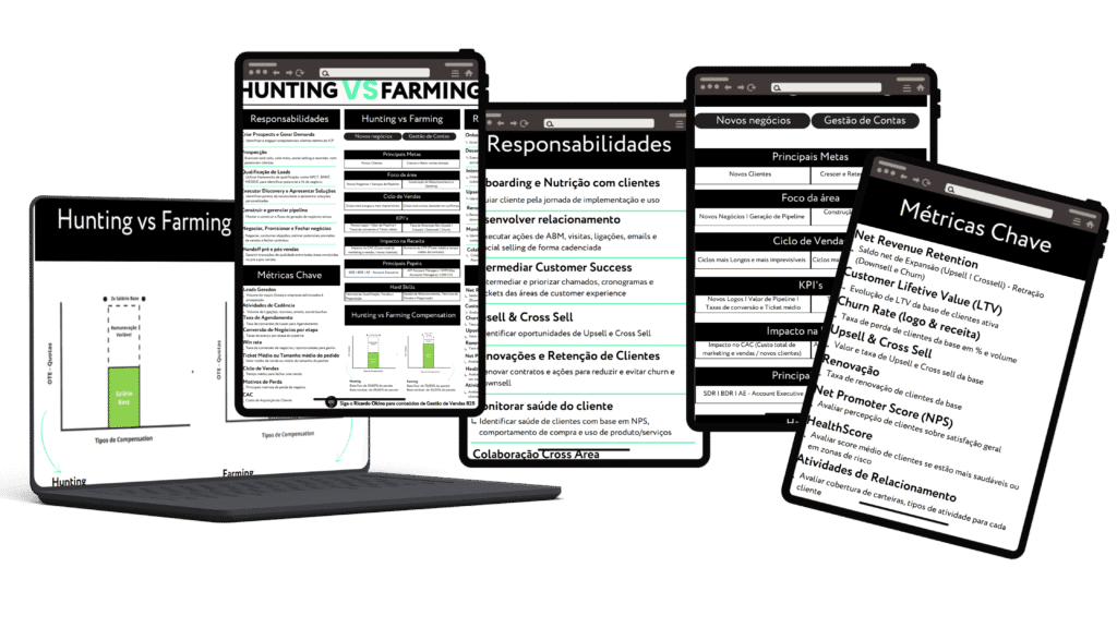 Baixe gratuitamente o benchmarking que compara os dois pilares das vendas: Hunting (prospecção ativa) vs Farming (desenvolvimento de contas).