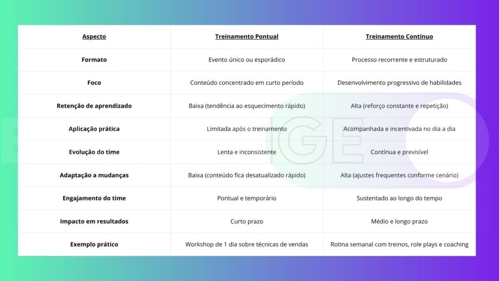 Sendo assim, treinar a equipe de forma estruturada ajuda a nivelar o conhecimento técnico e estratégico, diminuindo os extremos entre quem performa muito bem e quem está abaixo da média.